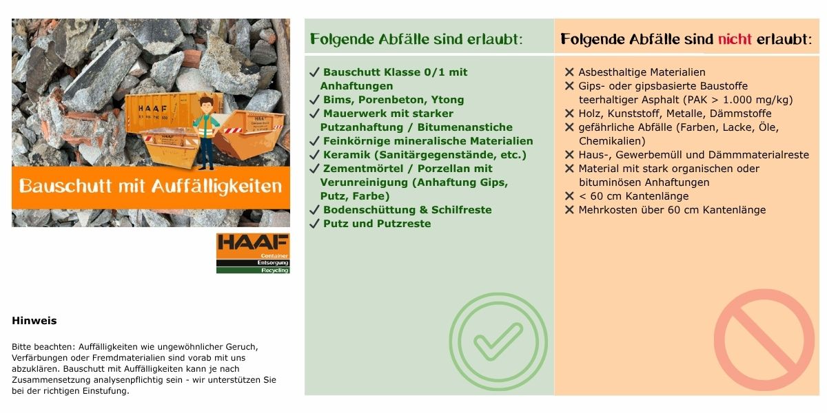 Nicht jeder Bauschutt ist sauber und frei von Fremdstoffen. Häufig treten sogenannte Auffälligkeiten auf.